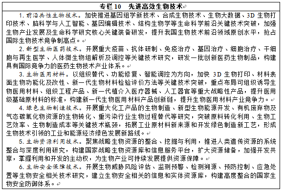 瞄准世界科技前沿,抢抓生物技术与各领域融合发展的战略机遇,坚持超前部署和创新引领,以生物技术创新带动生命健康、生物制造、生物能源等创新发展,加快推进我国从生物技术大国到生物技术强国的转变。重点部署前沿共性生物技术、新型生物医药、绿色生物制造技术、先进生物医用材料、生物资源利用、生物安全保障、生命科学仪器设备研发等任务,加快合成生物技术、生物大数据、再生医学、3D生物打印等引领性技术的创新突破和应用发展,提高生物技术原创水平,力争在若干领域取得集成性突破,推动技术转化应用并服务于国家经济社会发展,大幅提高生物经济国际竞争力。