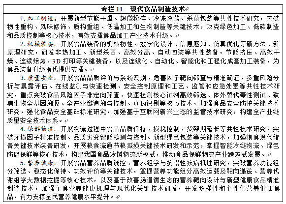 遵循现代食品制造业高科技、智能化、多梯度、全利用、低能耗、高效益、可持续的国际发展趋势,围绕标准化加工、智能化控制、健康型消费等重大产业需求,以现代加工制造为主线,加快高效分离、质构重组、物性修饰、生物制造、节能干燥、新型杀菌等工程化技术研发与应用;攻克连续化、自动化、数字化、工程化成套装备制造技术,突破食品产业发展的装备制约;重视食品质量安全,聚焦食品源头污染问题日益严重、过程安全控制能力薄弱、监管科技支撑能力不足等突出问题,重点开展监测检测、风险评估、溯源预警、过程控制、监管应急等食品安全防护关键技术研究;围绕发展保鲜物流,开展智能冷链物流、绿色防腐保鲜、新型包装控制、粮食现代储备、节粮减损等产业急需技术研发;以营养健康为目标,突破营养功能组分稳态化保持与靶向递送、营养靶向设计与健康食品精准制造、主食现代化等高新技术。力争到2020年,在营养优化、物性修饰、智能加工、低碳制造、冷链物流、全程控制等技术领域实现重大突破,形成较为完备的现代食品制造技术体系,支撑我国现代食品制造业转型升级和持续发展。