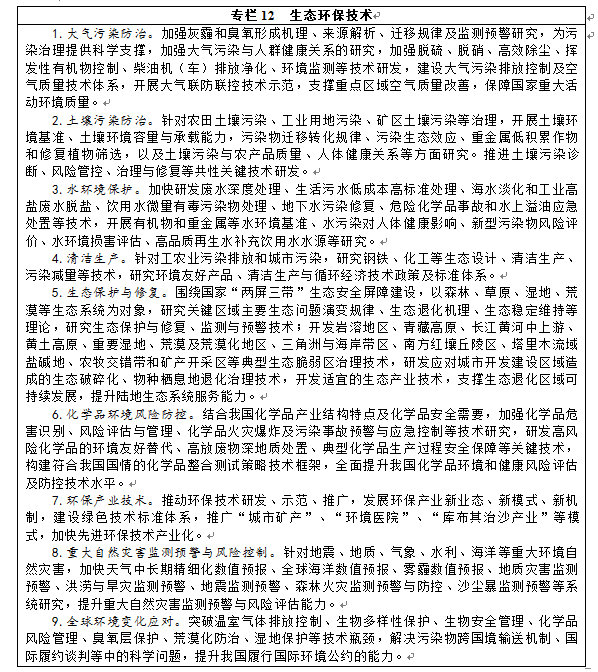 以提供重大环境问题系统性技术解决方案和发展环保高新技术产业体系为目标,形成源头控制、清洁生产、末端治理和生态环境修复的成套技术。加强大气污染形成机理、污染源追踪与解析关键技术研究,提高空气质量预报和污染预警技术水平;加强重要水体、水源地、源头区、水源涵养区等水质监测与预报预警技术体系建设;突破饮用水质健康风险控制、地下水污染防治、污废水资源化能源化与安全利用、垃圾处理及清洁焚烧发电、放射性废物处理处置等关键技术;开展土壤污染机制和风险评估等基础性研究,完善土壤环境监测与污染预警关键技术;加强环境基准研究;开展环境监测新技术和新方法研究,健全生态环境监测技术体系。提高生态环境监测立体化、自动化、智能化水平,推进陆海统筹、天地一体、上下协同、信息共享的生态环境监测网络建设。