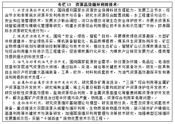 以保障资源安全供给和促进资源型行业绿色转型为目标,大力发展水资源、矿产资源的高效开发和节约利用技术。在水土资源综合利用、国土空间优化开发、煤炭资源绿色开发、天然气水合物探采、油气与非常规油气资源开发、金属资源清洁开发、盐湖与非金属资源综合利用、废物循环利用等方面,集中突破一批基础性理论与核心关键技术,重点研发一批重大关键装备,构建资源勘探、开发与综合利用理论及技术体系,解决我国资源可持续发展保障、产业转型升级面临的突出问题;建立若干具有国际先进水平的基础理论研究与技术研发平台、工程转化与技术转移平台、工程示范与产业化基地,逐步形成与我国经济社会发展水平相适应的资源高效利用技术体系,为建立资源节约型环境友好型社会提供强有力的科技支撑。