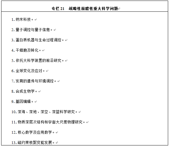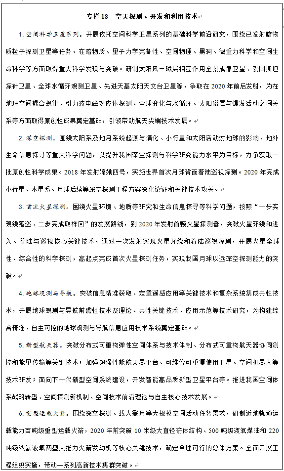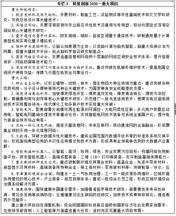 面向2030年,再选择一批体现国家战略意图的重大科技项目,力争有所突破。从更长远的战略需求出发,坚持有所为、有所不为,力争在航空发动机及燃气轮机、深海空间站、量子通信与量子计算、脑科学与类脑研究、国家网络空间安全、深空探测及空间飞行器在轨服务与维护系统、种业自主创新、煤炭清洁高效利用、智能电网、天地一体化信息网络、大数据、智能制造和机器人、重点新材料研发及应用、京津冀环境综合治理、健康保障等重点方向率先突破。按照“成熟一项、启动一项”的原则,分批次有序启动实施。