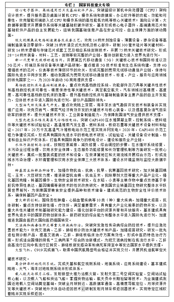 科技创新2030—重大项目与国家科技重大专项,形成远近结合、梯次接续的系统布局。在电子信息领域,形成涵盖高端芯片及核心软硬件研制、前沿技术突破和信息能力构建的整体布局;在先进制造领域,形成涵盖基础材料、关键技术、重大战略产品和装备研发的整体布局;在能源领域,形成涵盖能源多元供给、高效清洁利用和前沿技术突破的整体布局;在环境领域,形成由单一污染治理转向区域综合治理的系统技术解决方案;在农业领域,形成兼顾前沿技术突破和解决种业发展基本问题的整体布局;在生物和健康领域,形成涵盖重大疾病防治、基础健康保障服务和前沿医疗技术突破的整体布局;在太空海洋开发利用领域,形成涵盖空间、海洋探测利用技术的整体布局。