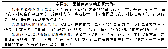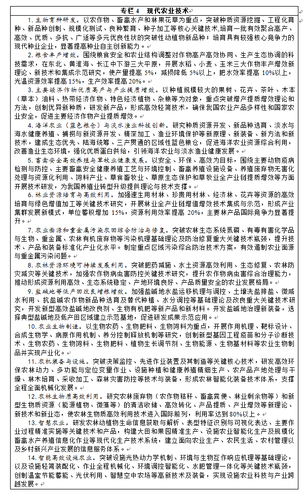 以加快推进农业现代化、保障国家粮食安全和农民增收为目标,深入实施藏粮于地、藏粮于技战略,超前部署农业前沿和共性关键技术研究。以做大做强民族种业为重点,发展以动植物组学为基础的设计育种关键技术,培育具有自主知识产权的优良品种,开发耕地质量提升与土地综合整治技术,从源头上保障国家粮食安全;以发展农业高新技术产业、支撑农业转型升级为目标,重点发展农业生物制造、农业智能生产、智能农机装备、设施农业等关键技术和产品;围绕提高资源利用率、土地产出率、劳动生产率,加快转变农业发展方式,突破一批节水农业、循环农业、农业污染控制与修复、盐碱地改造、农林防灾减灾等关键技术,实现农业绿色发展。力争到2020年,建立信息化主导、生物技术引领、智能化生产、可持续发展的现代农业技术体系,支撑农业走出产出高效、产品安全、资源节约、环境友好的现代化道路。