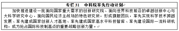 加快科研院所分类改革,建立健全现代科研院所制度。按照事业单位分类改革方案,继续深化公益类科研院所改革,建设完善法人治理结构,推动科研机构实行章程管理,健全规章制度体系,逐步推进科研去行政化,增强在基础前沿和行业共性关键技术研发中的骨干引领作用。建立科研机构创新绩效评价制度,研究完善科研机构绩效拨款机制。坚持开发类科研院所企业化转制方向,按照承担行业共性科研任务、生产经营活动等不同情况,实行分类改革、分类管理、分类考核。落实和扩大科研院所法人自主权。实施中科院率先行动计划,发挥其集科研院所、学部、教育机构于一体的优势,探索中国特色国家现代科研院所制度。