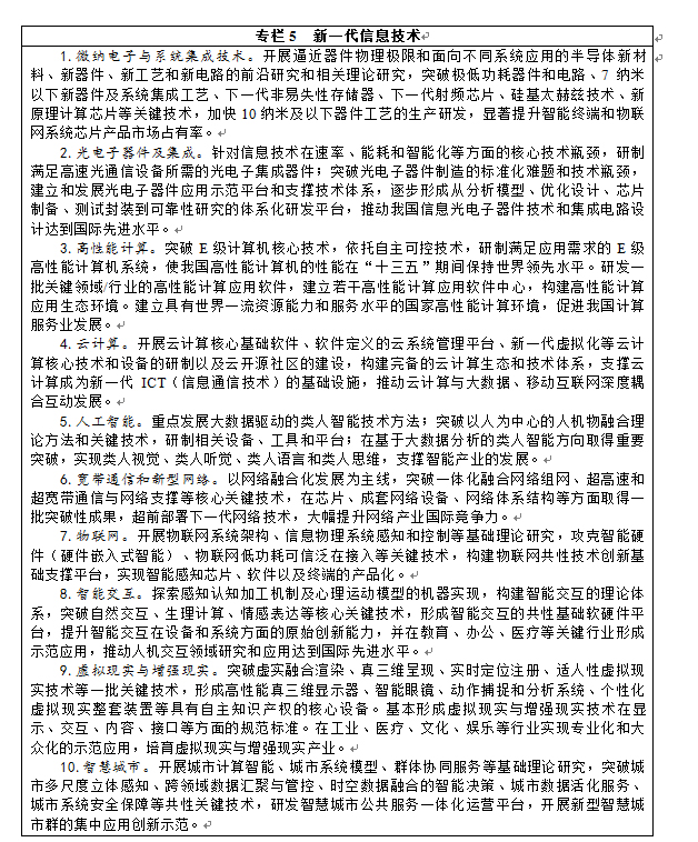 大力发展泛在融合、绿色宽带、安全智能的新一代信息技术,研发新一代互联网技术,保障网络空间安全,促进信息技术向各行业广泛渗透与深度融合。发展先进计算技术,重点加强E级(百亿亿次级)计算、云计算、量子计算、人本计算、异构计算、智能计算、机器学习等技术研发及应用;发展网络与通信技术,重点加强一体化融合网络、软件定义网络/网络功能虚拟化、超高速超大容量超长距离光通信、无线移动通信、太赫兹通信、可见光通信等技术研发及应用;发展自然人机交互技术,重点是智能感知与认知、虚实融合与自然交互、语义理解和智慧决策、云端融合交互和可穿戴等技术研发及应用。发展微电子和光电子技术,重点加强极低功耗芯片、新型传感器、第三代半导体芯片和硅基光电子、混合光电子、微波光电子等技术与器件的研发。