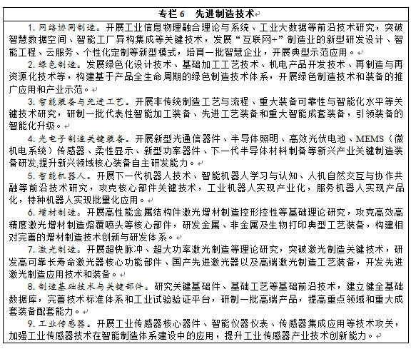 围绕建设制造强国,大力推进制造业向智能化、绿色化、服务化方向发展。发展网络协同制造技术,重点研究基于“互联网+”的创新设计、基于物联网的智能工厂、制造资源集成管控、全生命周期制造服务等关键技术;发展绿色制造技术与产品,重点研究再设计、再制造与再资源化等关键技术,推动制造业生产模式和产业形态创新。发展机器人、智能感知、智能控制、微纳制造、复杂制造系统等关键技术,开发重大智能成套装备、光电子制造装备、智能机器人、增材制造、激光制造等关键装备与工艺,推进制造业智能化发展。开展设计技术、可靠性技术、制造工艺、关键基础件、工业传感器、智能仪器仪表、基础数据库、工业试验平台等制造基础共性技术研发,提升制造基础能力。推动制造业信息化服务增效,加强制造装备及产品“数控一代”创新应用示范,提高制造业信息化和自动化水平,支撑传统制造业转型升级。