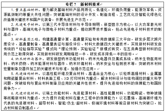 围绕重点基础产业、战略性新兴产业和国防建设对新材料的重大需求,加快新材料技术突破和应用。发展先进结构材料技术,重点是高温合金、高品质特殊钢、先进轻合金、特种工程塑料、高性能纤维及复合材料、特种玻璃与陶瓷等技术及应用。发展先进功能材料技术,重点是第三代半导体材料、纳米材料、新能源材料、印刷显示与激光显示材料、智能/仿生/超材料、高温超导材料、稀土新材料、膜分离材料、新型生物医用材料、生态环境材料等技术及应用。发展变革性的材料研发与绿色制造新技术,重点是材料基因工程关键技术与支撑平台,短流程、近终形、高能效、低排放为特征的材料绿色制造技术及工程应用。