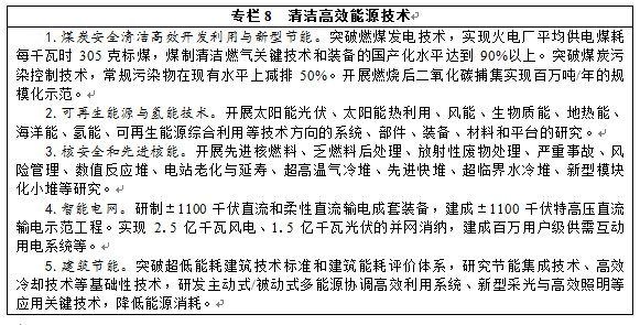 大力发展清洁低碳、安全高效的现代能源技术,支撑能源结构优化调整和温室气体减排,保障能源安全,推进能源革命。发展煤炭清洁高效利用和新型节能技术,重点加强煤炭高效发电、煤炭清洁转化、燃煤二氧化碳捕集利用封存、余热余压深度回收利用、浅层低温地能开发利用、新型节能电机、城镇节能系统化集成、工业过程节能、能源梯级利用、“互联网+”节能、大型数据中心节能等技术研发及应用。发展可再生能源大规模开发利用技术,重点加强高效低成本太阳能电池、光热发电、太阳能供热制冷、大型先进风电机组、海上风电建设与运维、生物质发电供气供热及液体燃料等技术研发及应用。发展智能电网技术,重点加强特高压输电、柔性输电、大规模可再生能源并网与消纳、电网与用户互动、分布式能源以及能源互联网和大容量储能、能源微网等技术研发及应用。稳步发展核能与核安全技术及其应用,重点是核电站安全运行、大型先进压水堆、超高温气冷堆、先进快堆、小型核反应堆和后处理等技术研发及应用。实施“科技冬奥”行动计划,为奥运专区及周边提供零碳/低碳、经济智慧的能源解决方案。