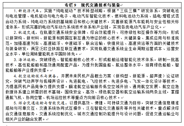 面向建设“安全交通、高效交通、绿色交通、和谐交通”重大需求,大力发展新能源、高效能、高安全的系统技术与装备,完善我国现代交通运输核心技术体系,培育新能源汽车、高端轨道交通、民用航空等新兴产业。重点发展电动汽车智能化、网联化、轻量化技术及自动驾驶技术,发展具有国际竞争力的高速列车、高中速磁浮、快捷货运技术与装备,发展轨道交通的安全保障、智能化、绿色化技术,研发运输管理前沿技术,提升交通运输业可持续发展能力和“走出去”战略支撑能力。